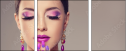Dreiteiliges Leinwandbild - Triptychon: Beautiful girl model with fashion violet make-up and purple design manicure on nails . Jewelry and cosmetics , large violet earrings